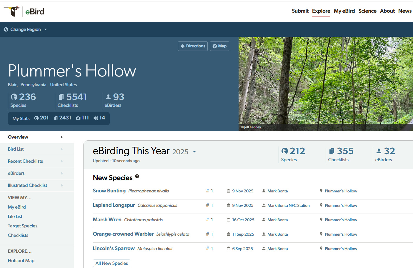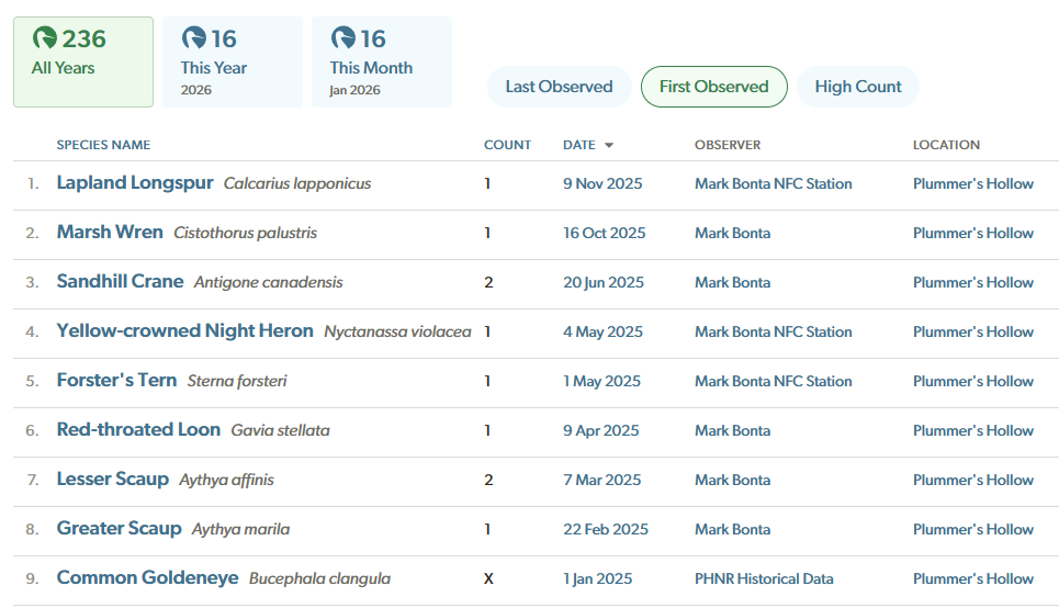 For a deep dive into 2025, you can of course consult the Plummer’s Hollow eBird hotspot homepage, now graced with a photo by Jeff Kenney.