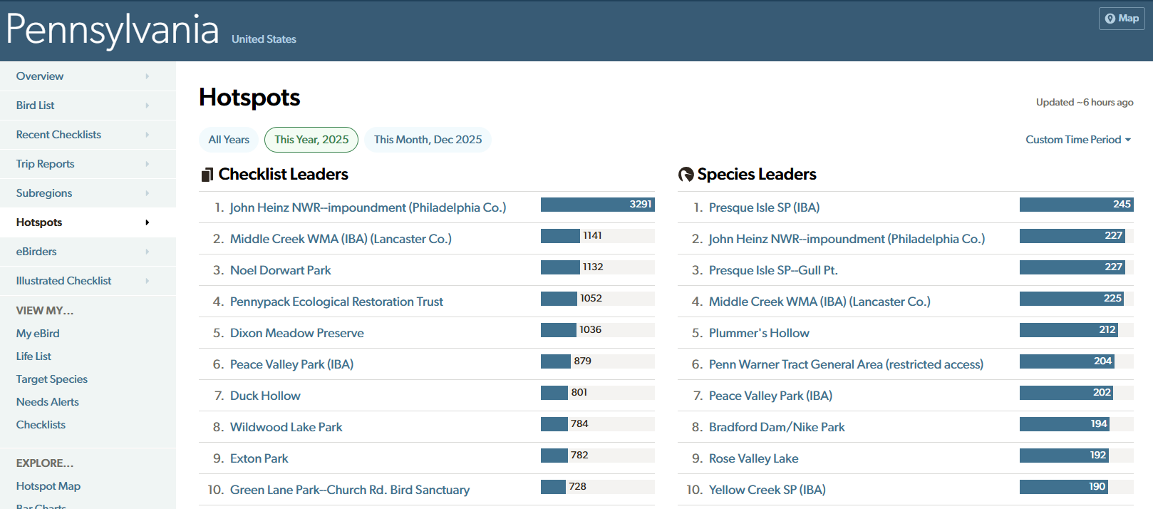 Plummer’s Hollow in 2025 once again attained the fourth-highest total among Pennsylvania hotspots, after Presque Isle, Middle Creek, and John Heinz. Our visible total was 212 species, but including two hidden species (Barn Owl and American Goshawk), we reached 214, 10 higher than the previous record. This suggests that with more consistent monitoring (e.g., more eyes, better optics, more functional NFC nights, more feeding stations, more specialized habitat, etc.), we might eventually attain 225 species or more in a calendar year.