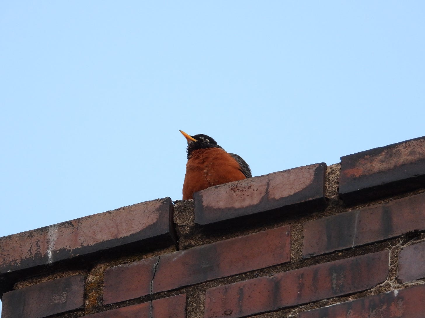 As March winds down, the balcony and other backside elements on our block of old, downtown buildings are invaded by curious, probing European Starlings, House Sparrows, House Finches, and American Robins. The nooks and cracks and crannies make perfectly protected spots to cram in their junk for messy nests, in competition with bats large and small, and soon, Chimney Swifts. I’m no doubt much fonder of this coming-alive of decrepit old walls and eaves and roofs than your average urban dweller; anyway, I’d be happy if birds took over our cities altogether. Hearing people complain about the mess and the noise is music to my ears—I’d rather that than the howls and screams and vomiting of desperate addicts, now a regular feature of the block’s front side along Pennsylvania Avenue, day and night, as they come and go from the laundromat, bus stops, and shelters, occasionally taking a wrong turn up the front stairs.