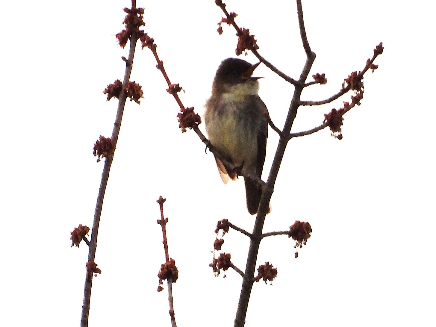 Sunday morning is sunny and still just below freezing, with a mid-level ceiling and that certain bird-friendly look associated with a promised warm-up in the afternoon. First off, an American Kestrel flies over the balcony heading north to hunt—it is, surprisingly, the first I’ve seen this year. At the same time as Friday, 7 AM, a single Great Blue Heron soars high over the point and veers south, just as it did two days again. Today, however, no vultures are out early, while the starlings keep me on my toes (and Merlin deeply confused) as they bleat out a dozen species. One insists on doing a mix of Tree Swallow and woodcock, while others stick to the more familiar meadowlarks, killdeer, and Ruby-crowned Kinglets. I’m interrupted from this by a familiar chip: the year’s first Yellow-rumped Warbler flits down the line of Bald Eagle Creek and lands on a budding twig at the confluence. Little does it know it marks the very beginning of our annual Warbler Season.