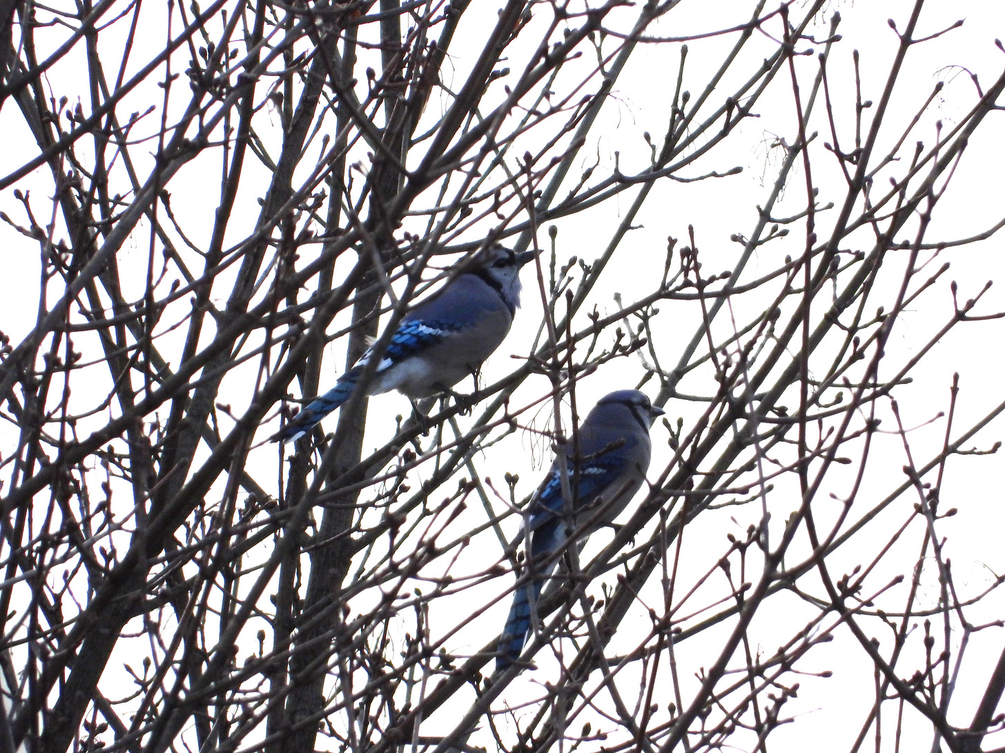On the 25th, dawn is a bit warmer, but still just below freezing. For the first time in a week, no Tufted Titmouse calls, but at least a single crow flies over (no Fish Crows, though—they seem to have abandoned Tyrone this year). The first-of-year (FOY) Eastern Meadowlark sings from over by the train station, and then a flight of Common Raven outsiders powers over high, in pairs, from the west to Plummer’s Hollow. A Belted Kingfisher rattlsd from somewhere down the muddy, flooded spring river, and suddenly, five rowdy Blue Jays peregrinate across my field of view, jumping and flapping through the trees down Bald Eagle Creek and then departing raucously for Thomastown.