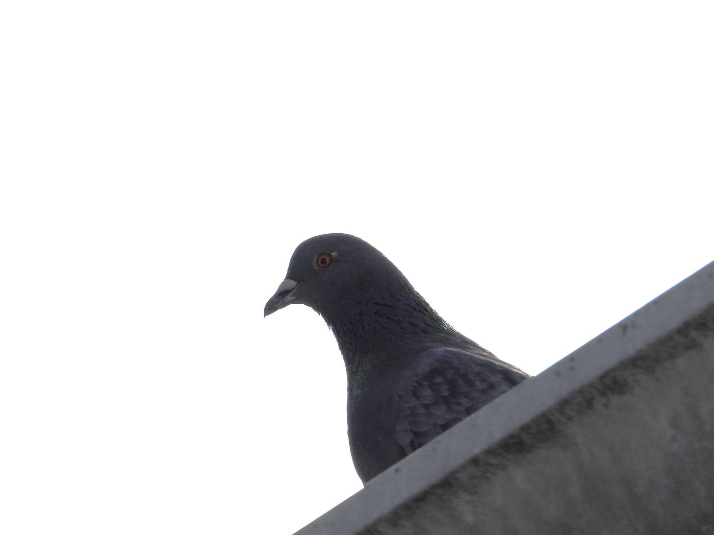 On the morning of the 24th, a Rock Pigeon suddenly dives down from nowhere and alights on the flaky roof next door—an oddity, as they rarely set foot here, preferring their haunts in the old brick junkyard buildings and downtown. I get to enjoy the 365-day aerial ballet of life-mated pairs and swirling flocks from afar, uplifting enough, but one has never spent enough time right here for Merlin to know of its presence.