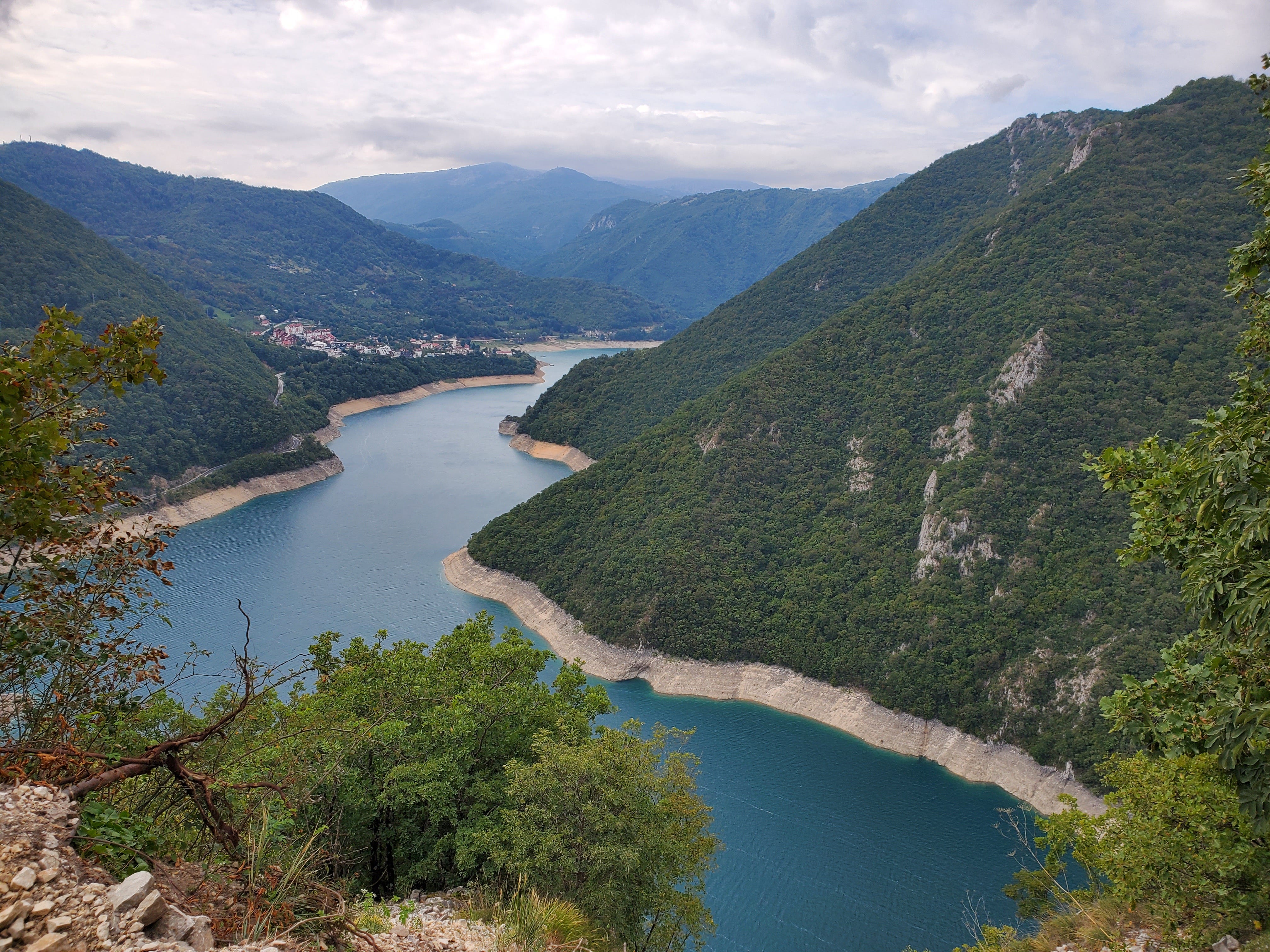 After some roadside coffee, my passengers bounced back from oblivion, and we wound down into the forested zone toward the Piva River, slightly west of the Tara (both are in the Danube drainage) with an equally deep and spectacular canyon. The road was now thankfully a full two lanes wide as it crawled down a nearly sheer canyon face through a series of ill-lit tunnels in between hairpin turns. At the bottom was Lake Piva, a reservoir ensconced in a landscape as spectacular as any I’ve seen. We headed north and eventually crossed over at the dam, continuing to follow the Piva downstream to its junction with the Tara (where they form the Drina) and the border of Republika Srpska.