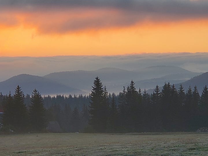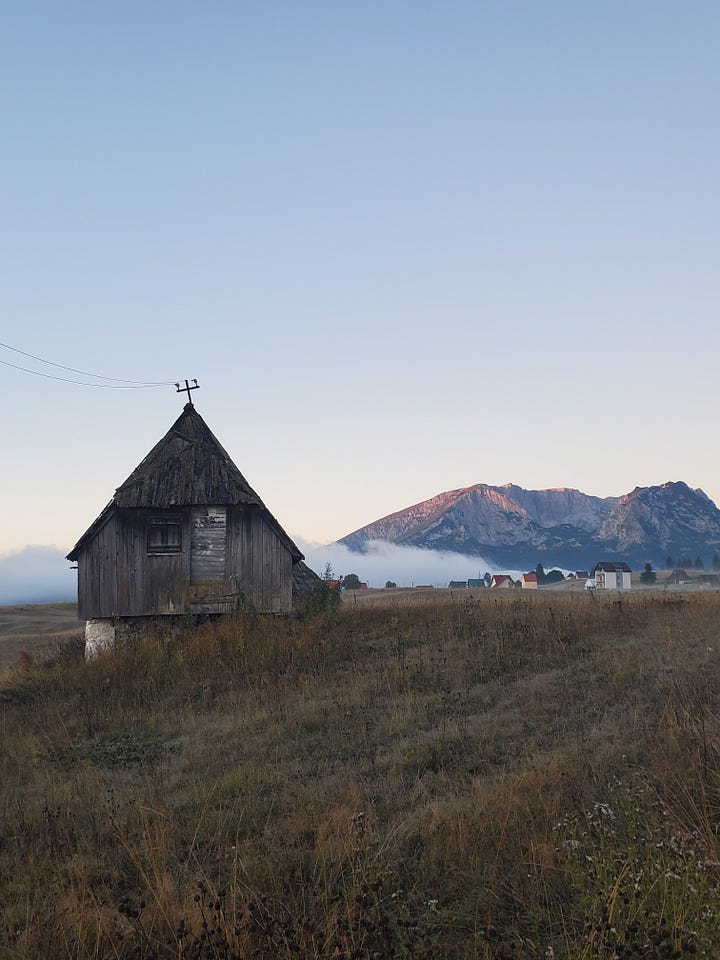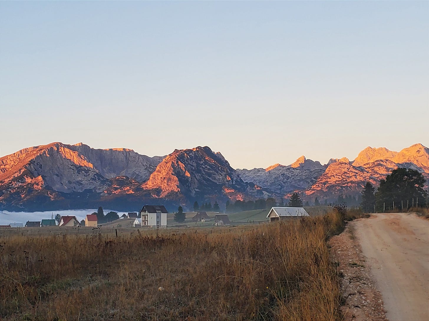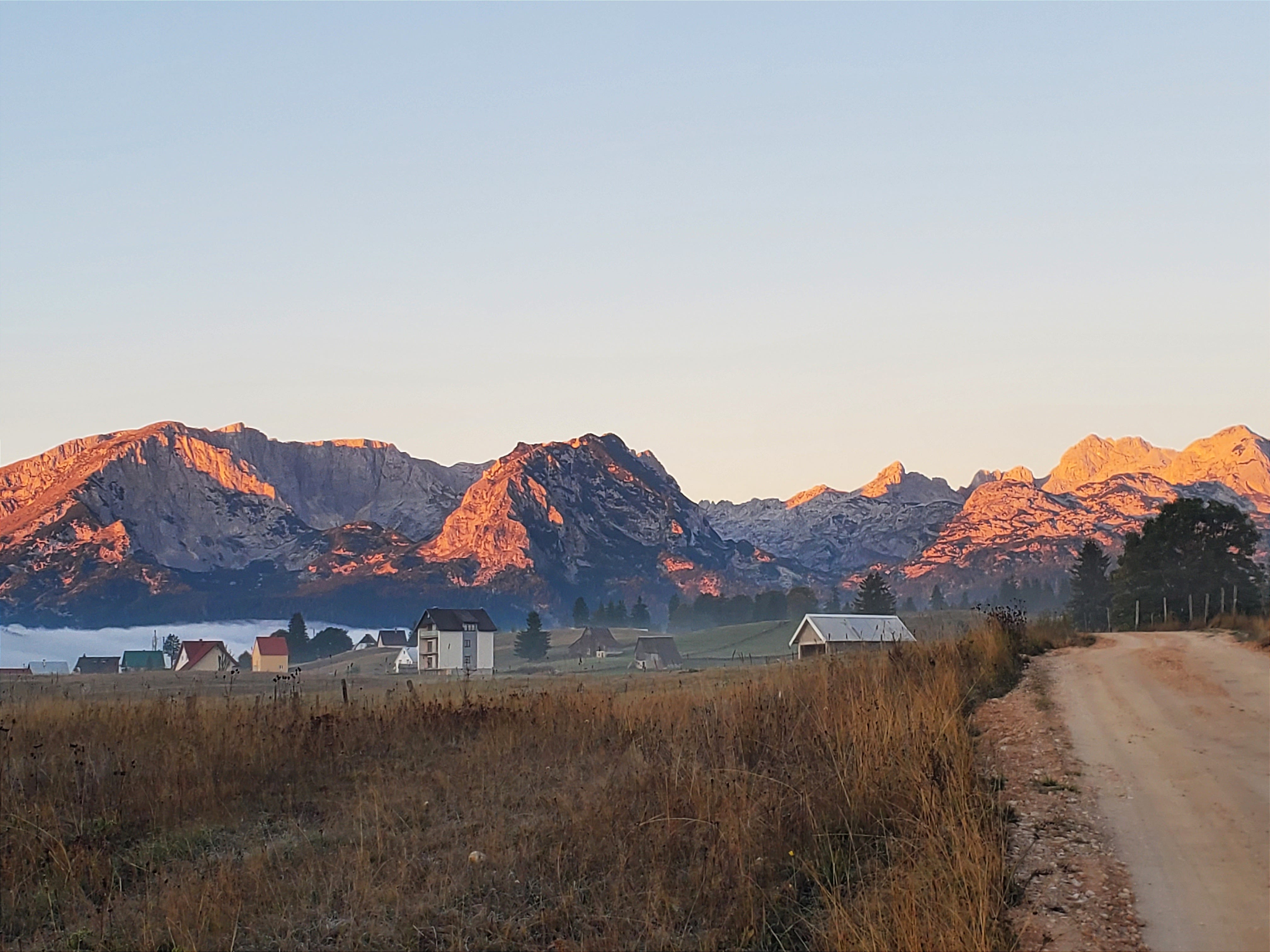 I was up well before dawn for the chorus. Merlin did very well, correctly ID’ing the peeps and songs of the earliest risers in and above the thick forest — Eurasian Robin, Hawfinch, Common Chaffinch, Eurasian Blackbird. With temperatures in the 20s, I had to move quickly from spot to spot along the edge of the plain to keep from freezing. The Durmitor massif, bathed in pink, was fronted by a few architectural relics of a largely abandoned vernacular pastoral landscape. Sprouting elsewhere like mushrooms were dozens, if not hundreds, of tasteful and not-so-tasteful cabins, chalets, weekend homes, and even condos, testament to the rapid tourist development in the region.