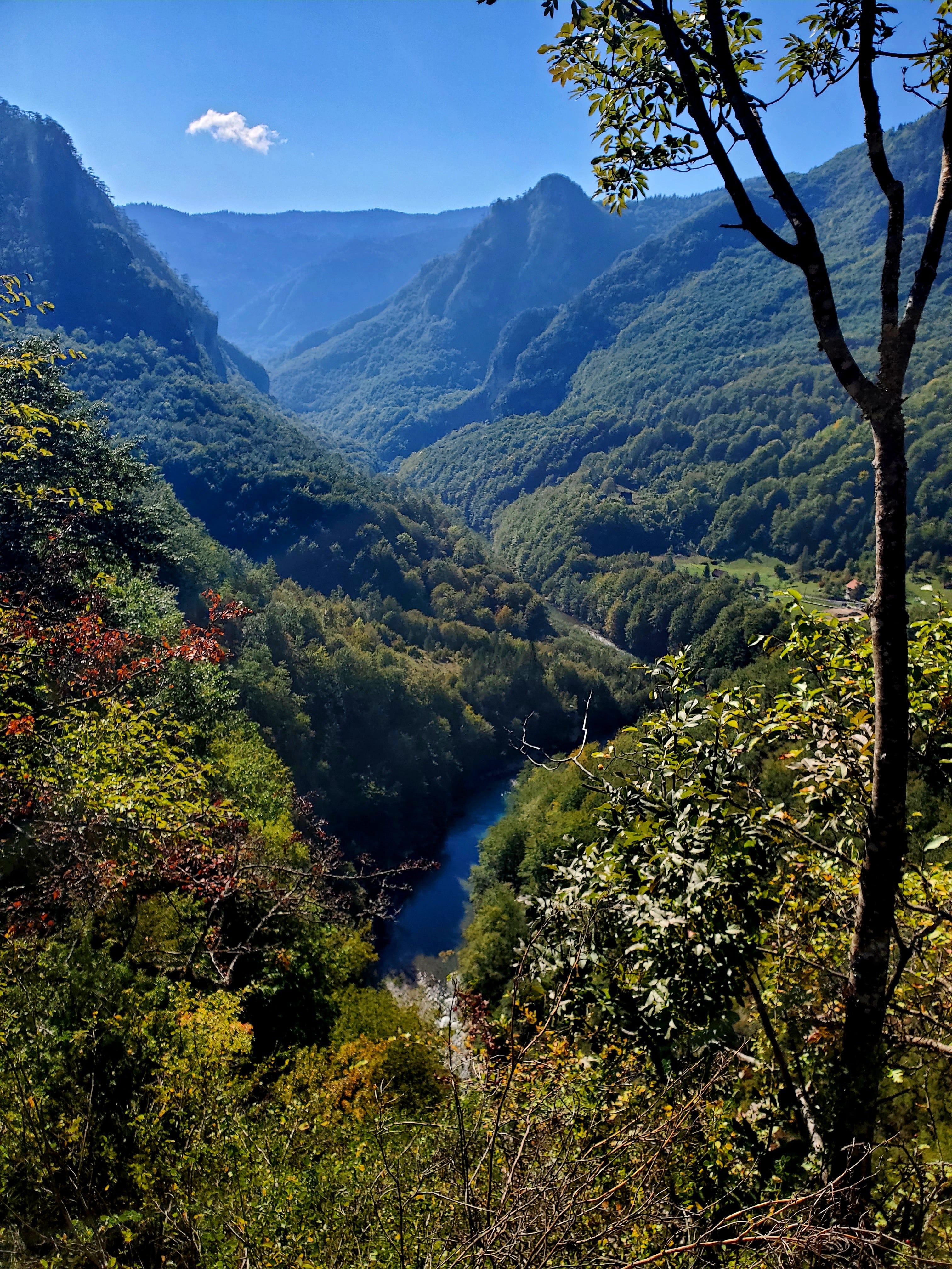 Later, we headed to the best vantage points for the Tara River Canyon, one of Earth’s deeper gashes, 4,300 feet down at certain points and 50+ miles long. Our first attempt, at the Đurđevića bridge, was a bit disappointing. The span, 564 feet over the river, was undergoing loud and dusty construction (merited, no doubt, as it was erected during the Kingdom of Yugoslavia era in the late 1930s).
