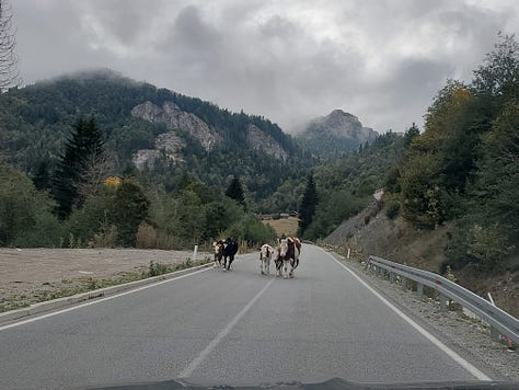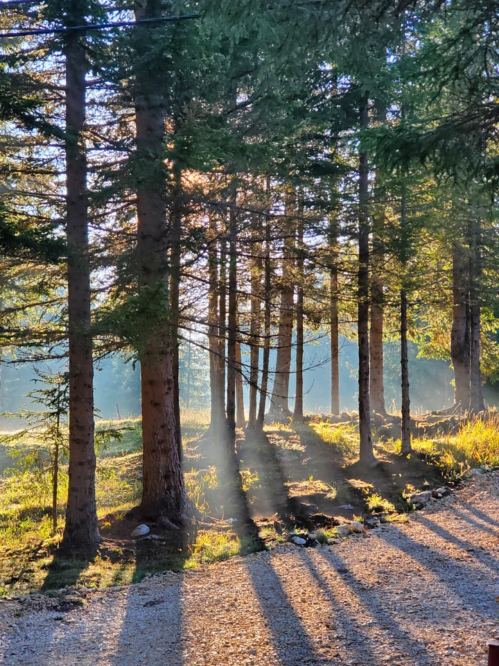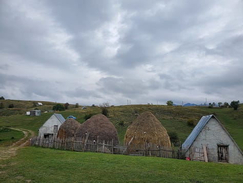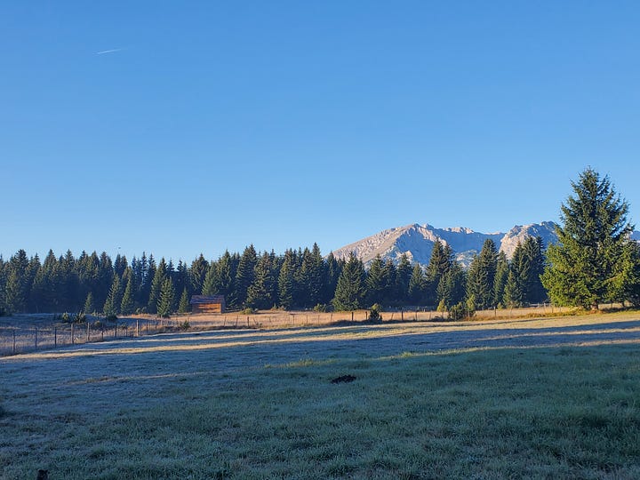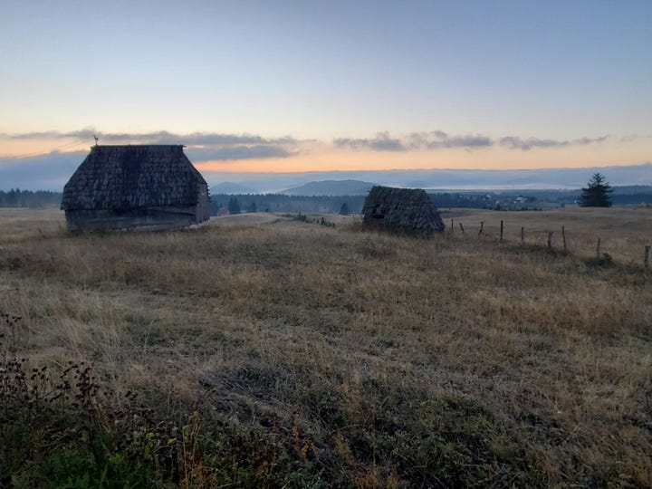 Once atop the grassy, mile-high Sinjajevina Plain, with deep sighs of relief we exited the narrow country lane we had spent the last three hours on, onto a regularly narrow road that went by the burgeoning alpine resort town of Zabljak (“SHOB-lee-ock”) and then on through a series of angular, bumpy gravel tracks to our cozy chalet, the newest in a row of them tucked into the edge of the spruce forest.