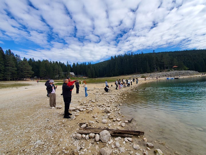 Were it not for the presence of the national park, the lake would already be engulfed by the town, I think. A well-groomed, flat trail leads from the many parking lots of the condo zone through a towering spruce forest, reminder that Montenegro has some of the oldest and tallest forests left in Europe. Even at the end of September, the crowds were still considerable (mostly Chinese and Japanese tourists in very large groups). Prim kiosks lined the park trail, each selling a large variety of local fruit brandy, honeys, refrigerator magnets, and knit hats and gloves.