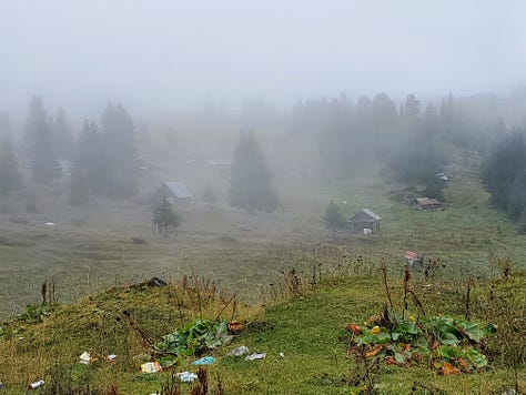 First into the visible sky were hundreds of raucous Hooded Crows who streamed out of the blackish depths of the forest, swirling overhead and disappearing in the direction of Zabljak. As the sun reached my pacing ground, flocks of thrushes, tits, and others rushed in from all directions, converging on a grove of Norway spruce (or were they silver fir?) and from there, diving down to bare patches around the many construction sites eating away at the old pastures. This was, I surmised, a migrant wave, some consolation for missing it in my own hemisphere. The only species that raised an eBird eyebrow was the Fieldfare, a spot-breasted Turdus fresh from the far north; when I returned the following (rainy) morning, many more of them were about.