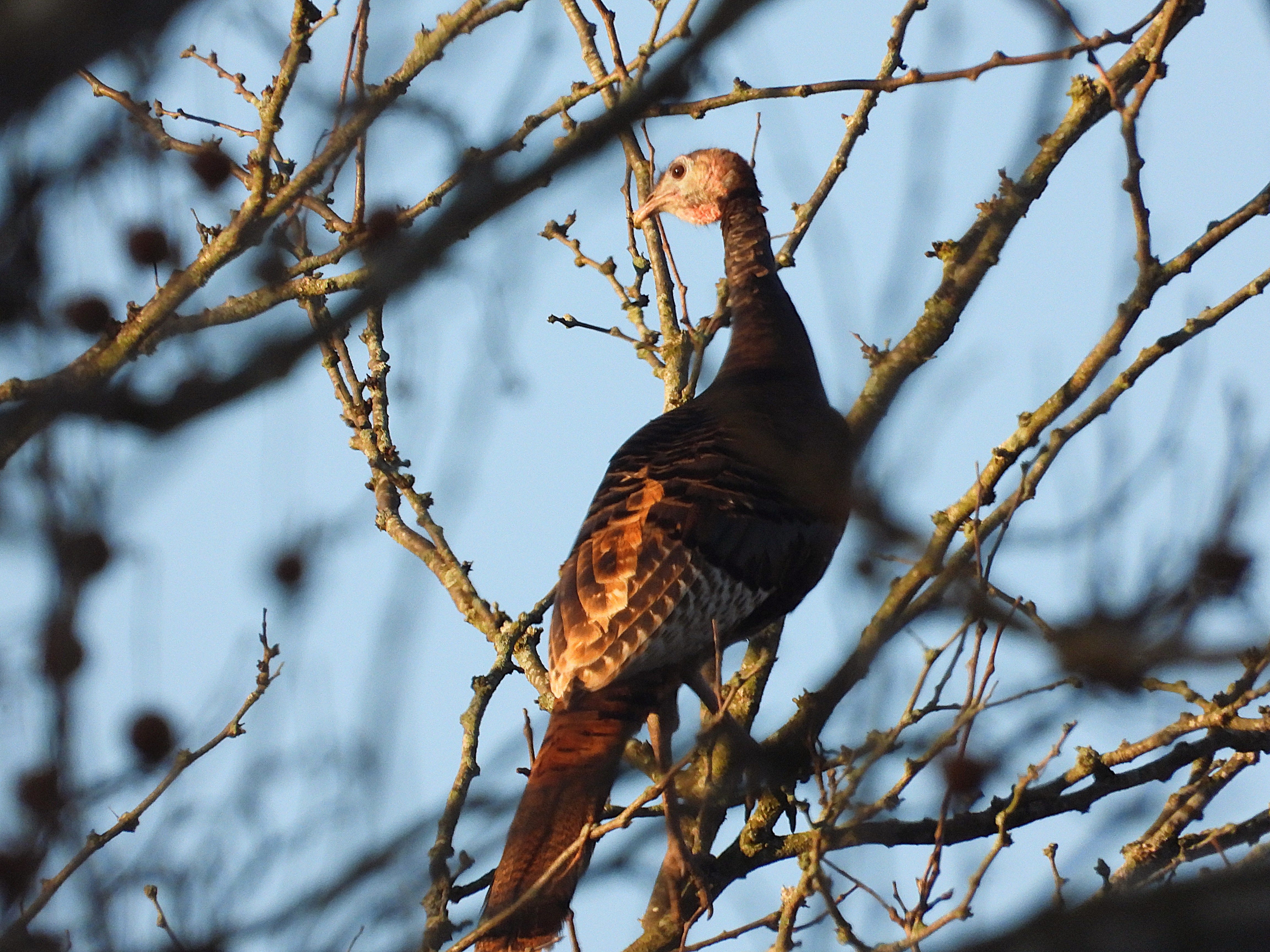 At dawn on March 9th it’s 31 degrees and mostly clear. An Eastern Phoebe is back at the confluence, though not yet singing. It flits about, calling, tail-flicking, and searching for bugs. Glorious sunlight, a rare thing these days, is a signal for me to retreat to the kitchen, but when I go back out to grab some gear, 17 massive shapes appear as if from nowhere, or at least from beyond Burger King. They coast over 10th Street, barely clear the balcony, and land not at all awkwardly in a tree by the bank. I’ve seen Wild Turkeys from the balcony once before, flying from the thick forests of Cemetery Hill, over downtown, and landing on Brush Mountain above the interstate, but this is getting ridiculous. After snapping a few close-ups before they head off up the river, I do some searching online, only to find out that turkeys do become urban dwellers, not least in Cambridge, Massachusetts, of all places!