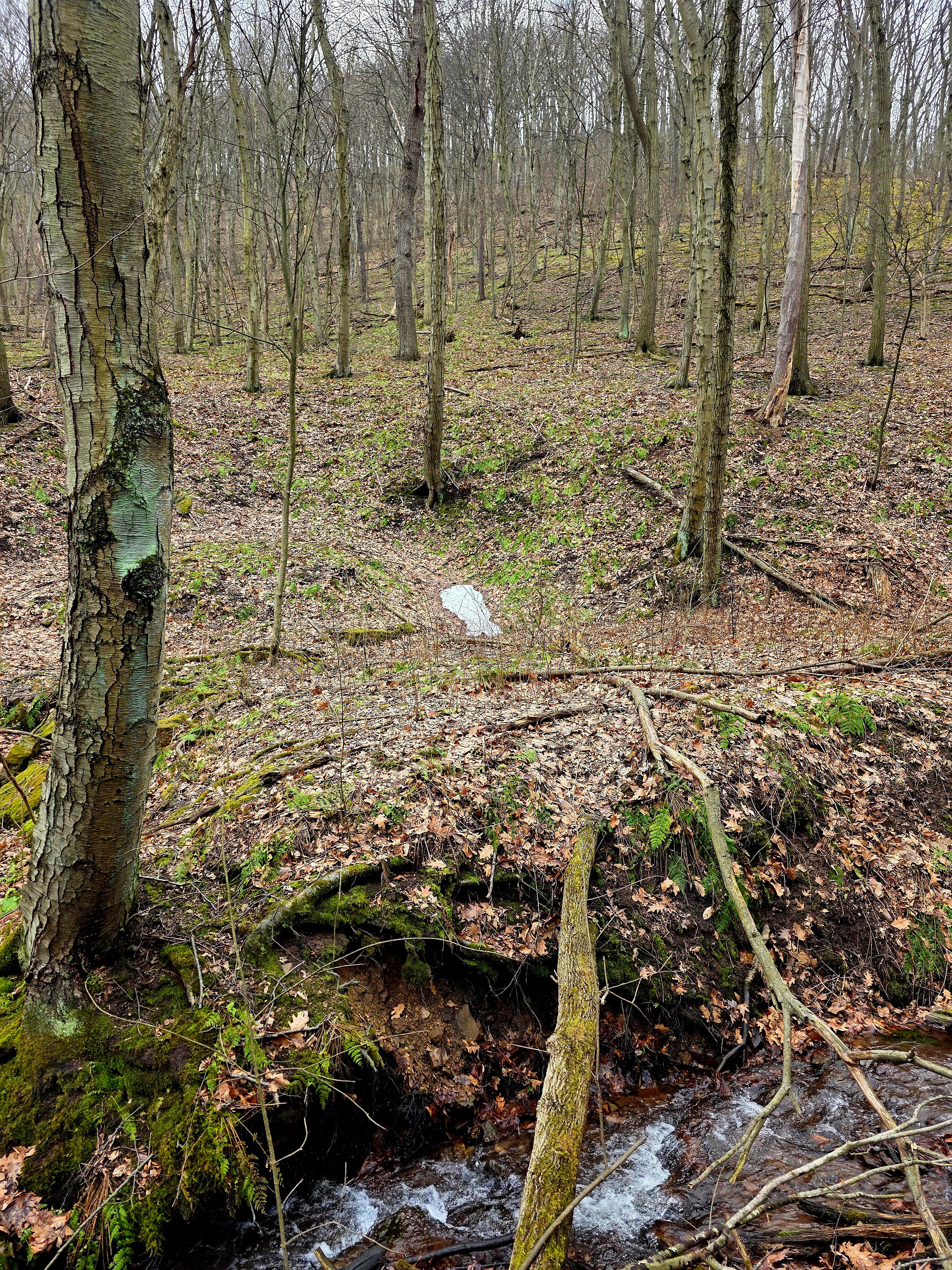 I scramble across the steepest parts of the ridge and my body doesn’t thank me later, all to stay well above the rush of the swollen stream so I can catch any hint of an early Pine Warbler. No luck there. And despite the rain, the very last patch of January snow survives in its hollowed space across from the signboard.