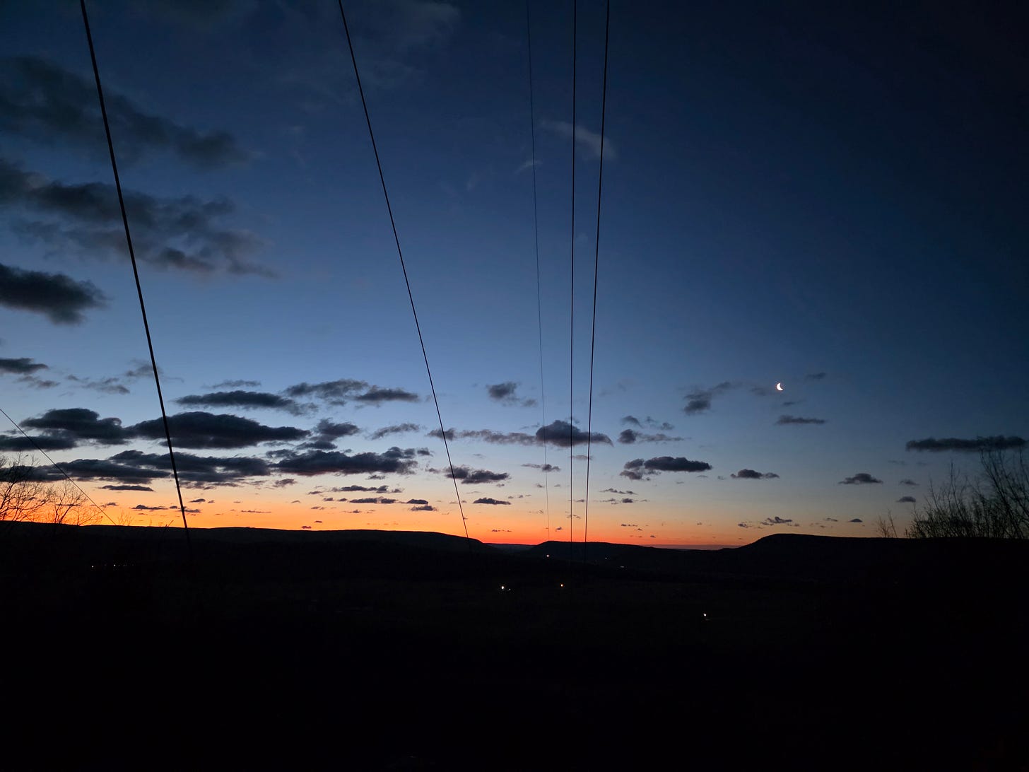 The first warm evening sees temperatures in the high 50s, so I sit out to witness the return to roost. Past seven, Turkey Vultures are still returning from the east to their roost on the west side of town; the last go by in the growing dusk of 7:15. Grackles mostly come back west in small flocks through the Gap between 7:05 and 7:15, over 80 in all. Once clear of the Gap, some turn north, others go overhead, and some turn west toward various roosting spots.