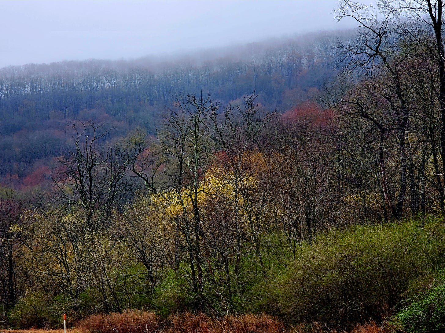 Instead of hiking the Hollow road I head straight up the Sapsucker Ridge knife-edge, getting above the echoing songs of Louisiana Waterthrushes, already a week back. I cut across on high trails, every brush of a leafing barberry depositing ticks on my pants, jackets, and arms. Not far back in, the first Blue-headed Vireo sings, and then a pair of Wild Turkeys scoots down through the underbrush and the female begins to screech. An entire lek of five Eastern Phoebes is having at it up in the trees, calling and singing and flying about.